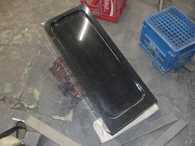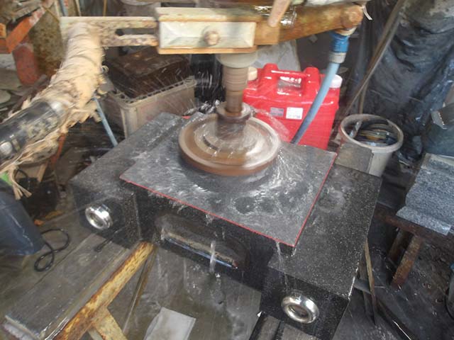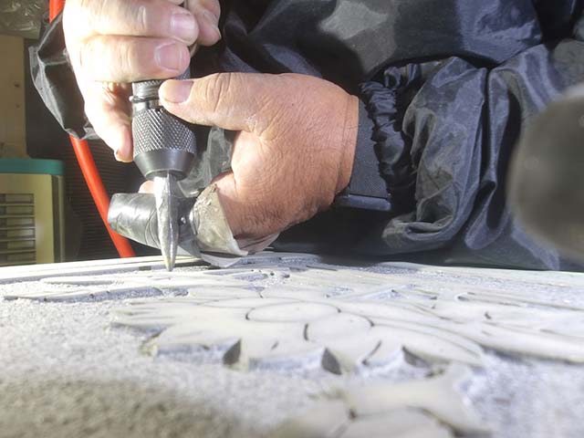 竿石と水鉢の字彫り後にさらい作業を行います。